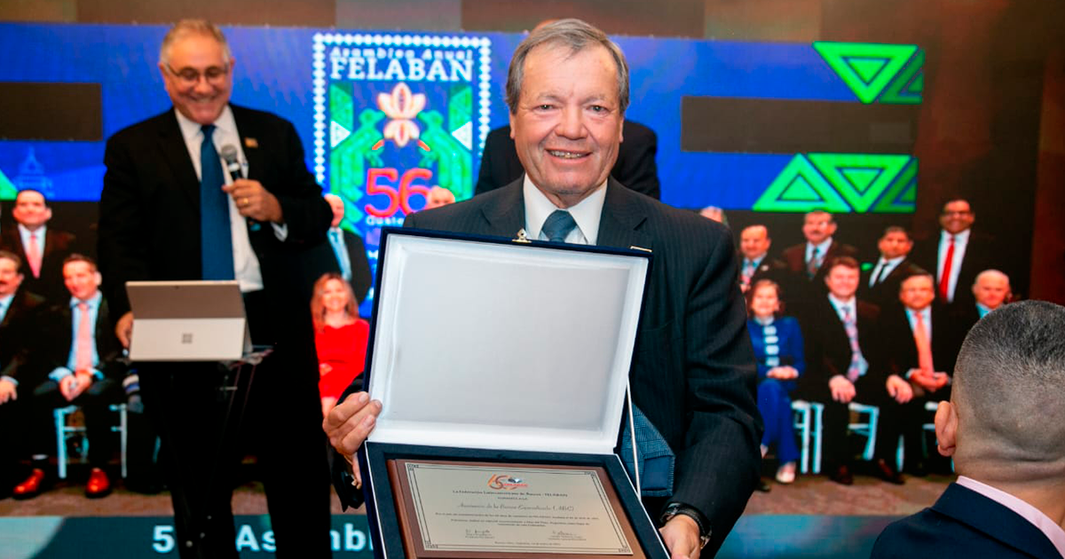 El presidente de Felaban, Raúl Guizado, y el secretario general, Giorgio Trettenero Castro, entregaron el reconocimiento al presidente de ABE, Hugo Flores Lazdin.