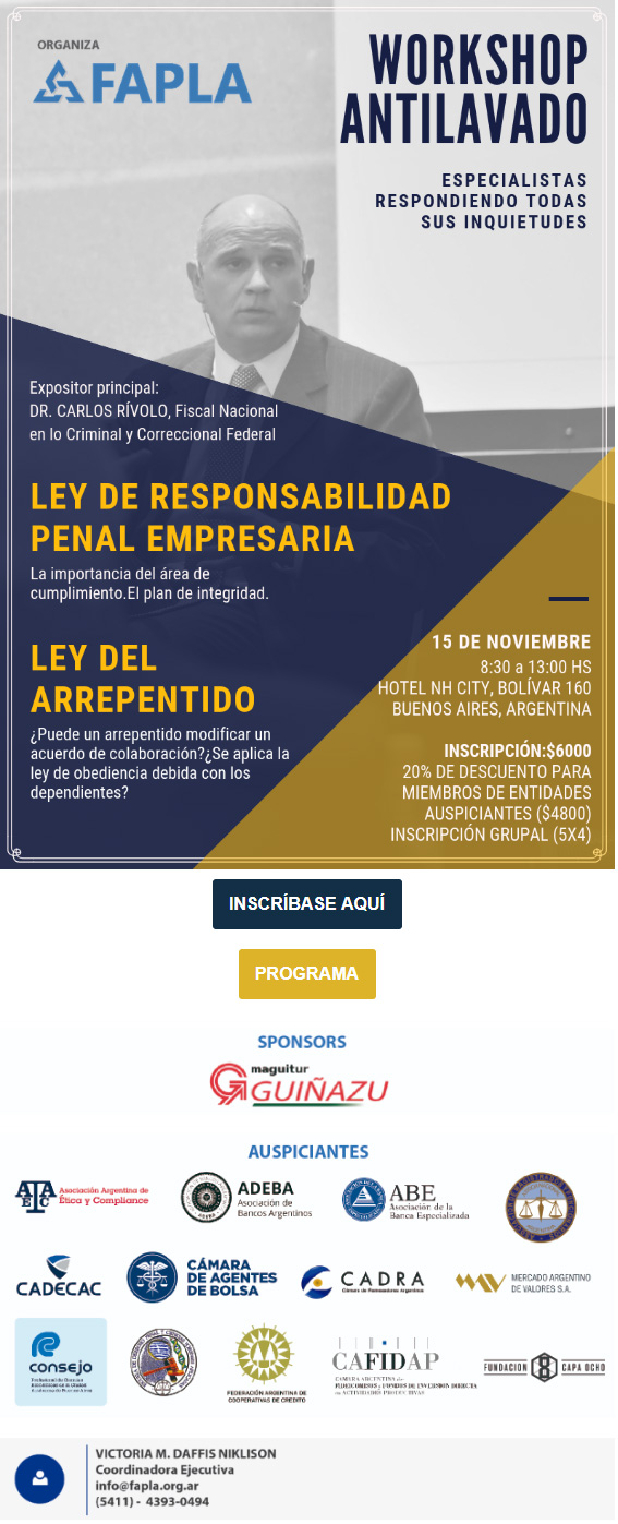 Como todos los años FAPLA liderada por un equipo interdisciplinario de profesionales que tiene como objetivo promover el análisis de la problemática derivada de la prevención y control del lavado de activos y financiación del terrorismo, invita a participar del próximo WORKSHOP ANTILAVADO, que tendrá como principal expositor al Dr Carlos Rivolo, Fiscal Nacional en lo Criminal y Correccional Federal, en el que se abordará entre otros temas las LEYES DEL ARREPENTIDO Y DE RESPONSABILIDAD PENAL EMPRESARIA.